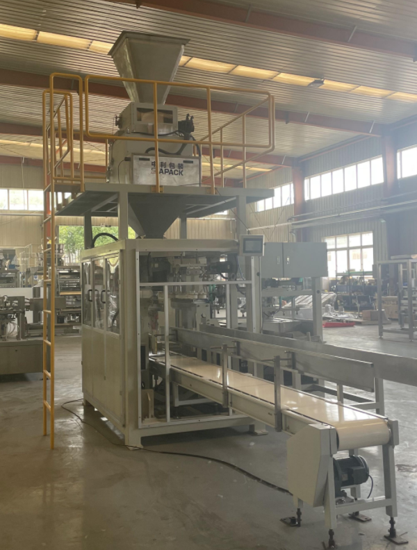 Ši pakavimo mašina sukurta granulių medžiagų, pvz., chemijos, pašarų, grūdų ir sėklų laukų, pakavimui. Įrenginyje yra automatinio maišų paėmimo, automatinio užpildymo, automatinio maišų transportavimo ir sandarinimo funkcija. Jį galima susieti su visų rūšių granuliuotų medžiagų gamybos įrangos dirbti, kad būtų galima atlikti be priežiūros didelių gabaritų pakavimo operacijų gamybą.LCD jutiklinio ekrano valdymas .Palankesnė žmogaus ir kompiuterio sąsaja .Automatinė gedimų diagnostika .Apsauga nuo išjungimo. Greitas reguliavimas ir lengva priežiūra.