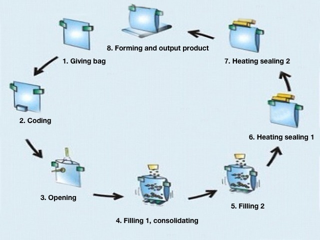 Greitis 10-35 maišeliai/min (greitis priklauso nuo gaminio būsenos ir užpildymo svorio)) Svoris 1400 kg 1520 kg 1580 kg 1650 kg Įtampa 380V 3 fazių 50HZ/60HZ Bendra galia 2KW 2.2kw 2,5kw 2,5kw Suspausti orą 0.8m3/min(vartotojo tiekimas) 8bar Produkto procesas