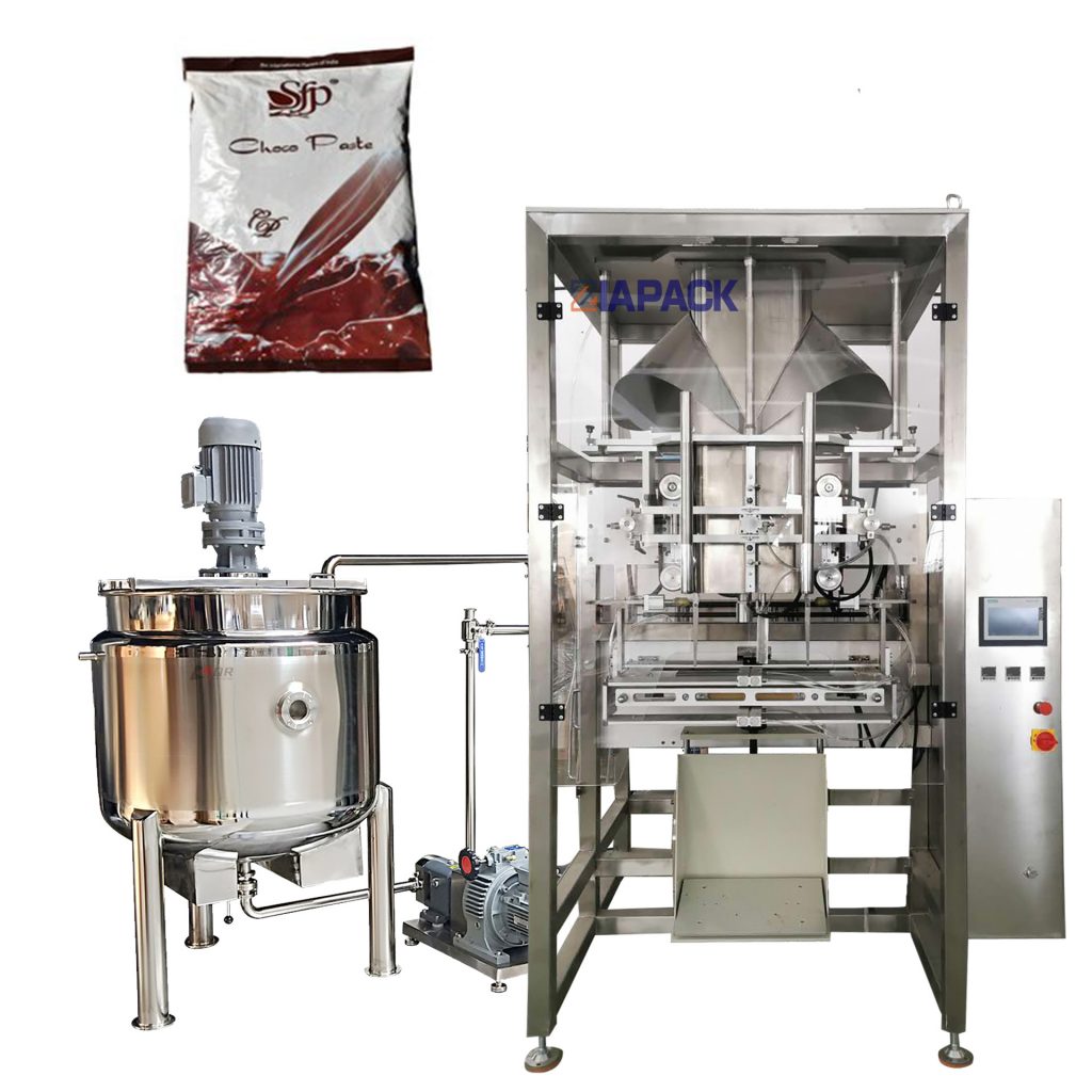 Šis mašinų blokas yra specialus dizainas, skirtas mažiems padažo produktams, pvz., kečui, čili padažui, žuvies miltams ir pan., pakuoti. Aparatas gali automatiškai pagaminti maišelį, pasverti gaminį, supilti produktą į maišelį ir išvesti konvejerį. yra valdomi PLC ir gali veikti jutikliniame ekrane. Lengva reguliuoti ir prižiūrėti.