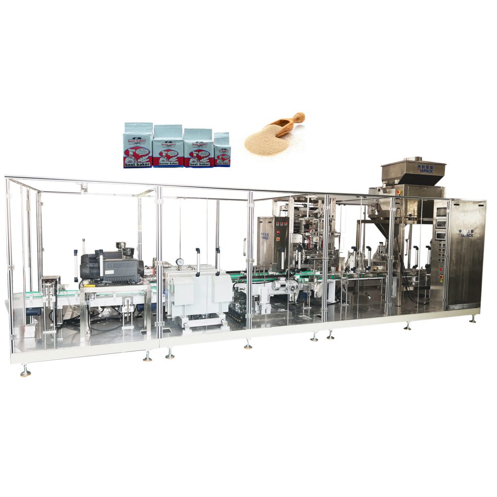 Į šią mašiną įeina vienas rinkinys ZK3 vakuuminis liftas, skirtas sausoms mielėms paduoti, vienas komplektas ZL520 vertikalių maišelių pakavimo ir sandarinimo mašina. Vienas rinkinys ZLC4-2000 keturių kaušų svėrimo mašina, vienas komplektas ZL-100V2 dvigubos vakuuminės kameros pakavimo aparatas. Ši mašina plačiai naudojama maisto vaistinių chemijos ir kitų produktų pakavimui į miltelius arba mažas granules. Kaip kavos milteliai, mielių milteliai, kvietiniai miltai ir tt. Visa mašina viduje siurbiama į vakuuminį produktą. Vakuuminis laipsnis yra labai aukštas, o pakavimo greitis yra labai didelis, gali siekti 30 maišelių / min. Galutinis produktas turi ilgą galiojimo laiką ir gražią formą.